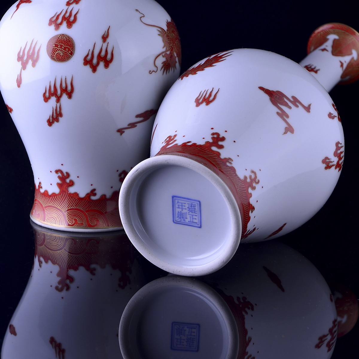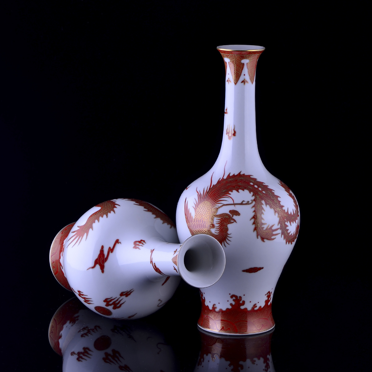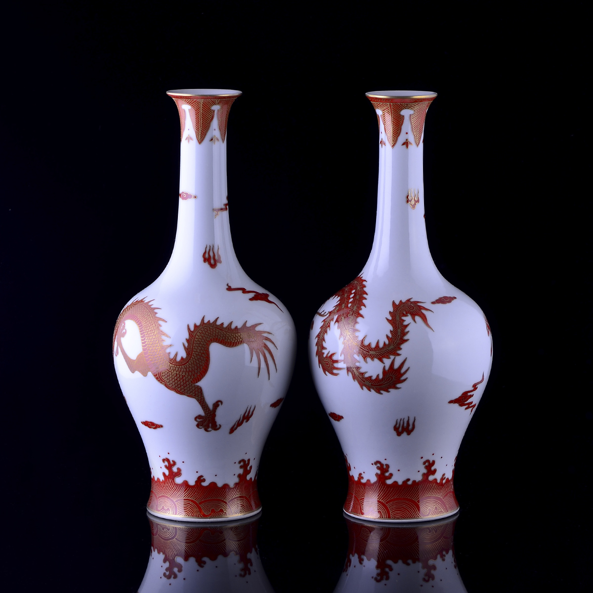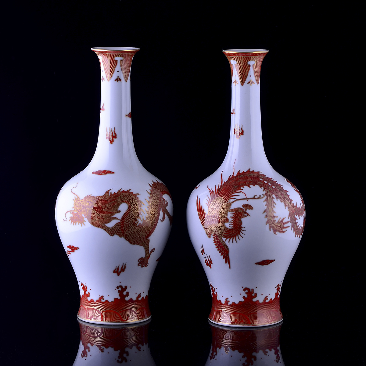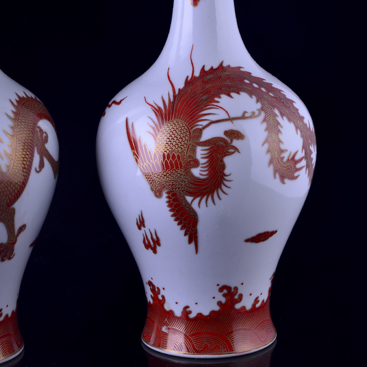 C80 仿古乾隆《矾红描金龙凤纹橄榄瓶》(2个)