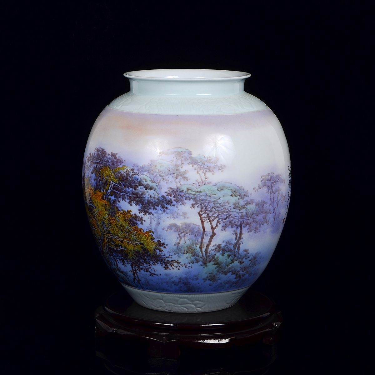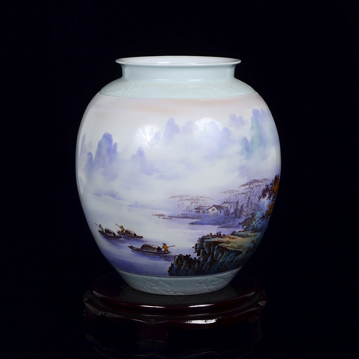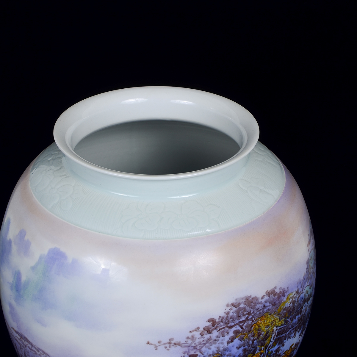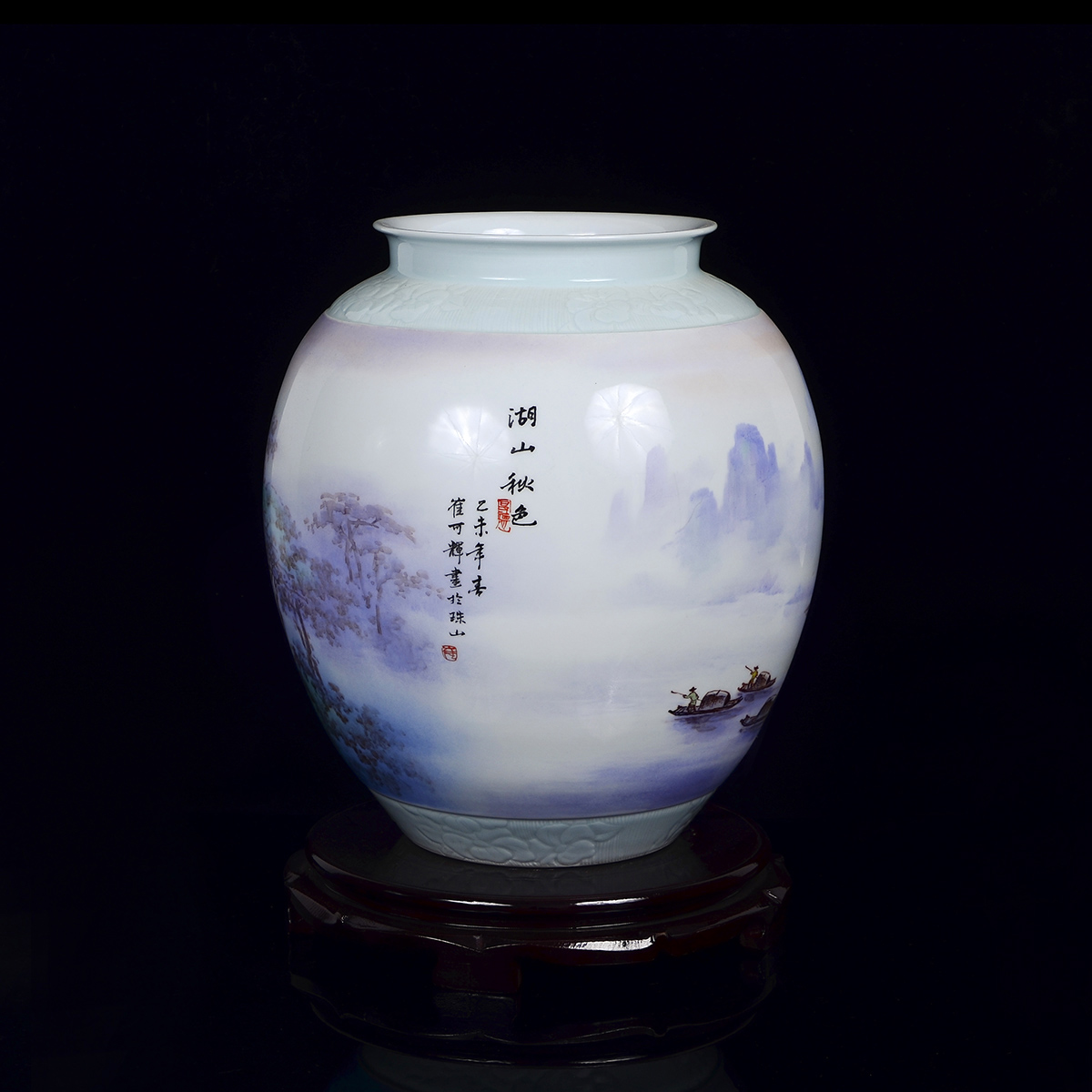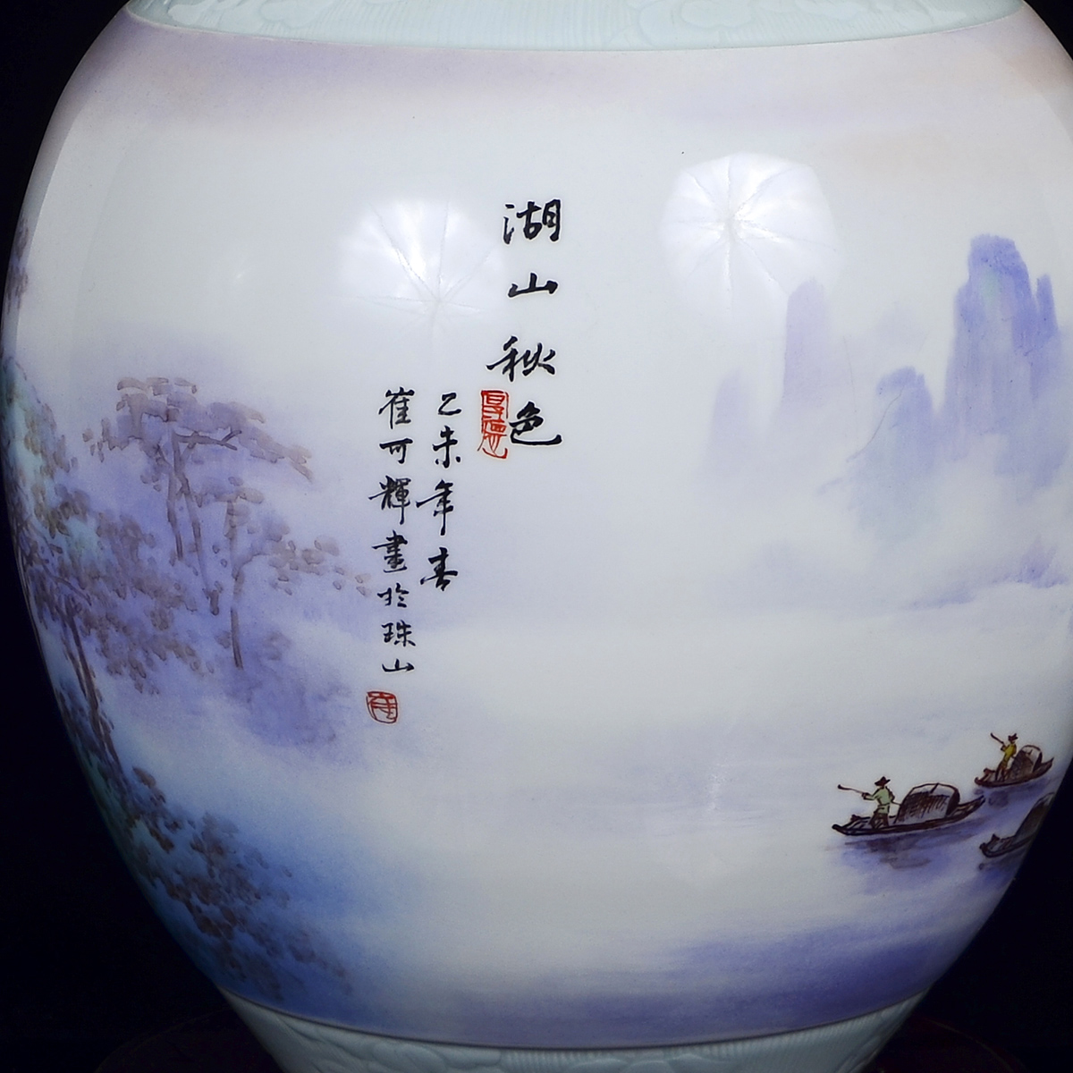 作品介绍:作品创作于2015年,作品肩足部刻花花卉纹,施以青釉装饰,温润剔透。瓶身用新彩小写意手法创作,取安徽黄山秋季晨暮,大色块绘山石苍劲有力,光影转折明快爽朗。近处捕鱼船队,刻画笔笔分明,渔夫动态各异。远处云雾缭绕用色独特搭配柔和,云雾、青山、劲石相互映衬,一片林深幽静的景象。