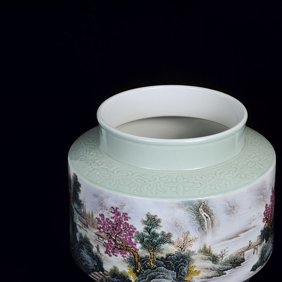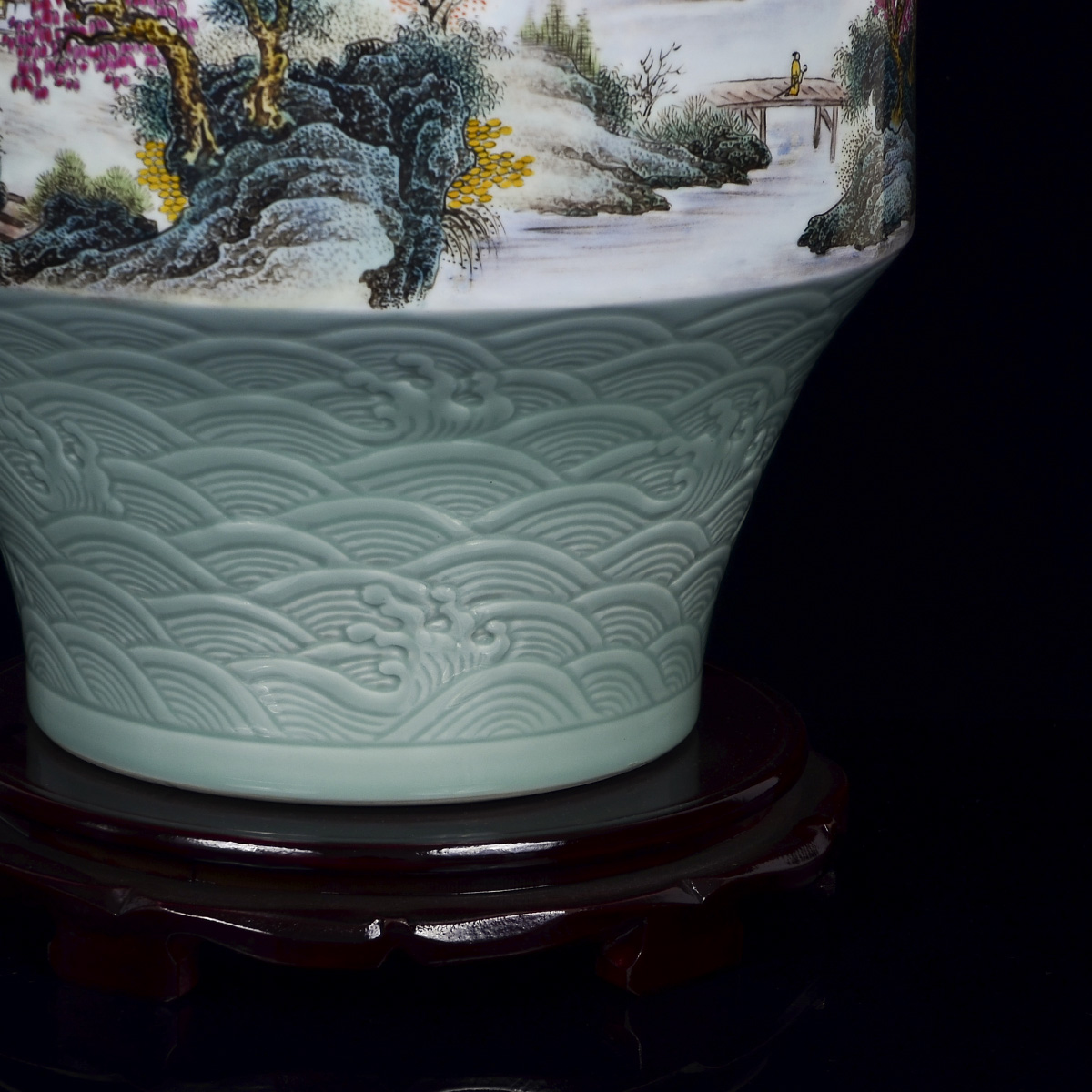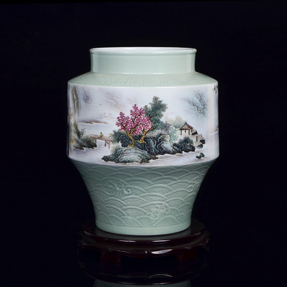 作品介绍:作品创作于2013年,与世博会金奖作品属同一风格。肩部刻花缠枝纹饰,足部刻以桃花海水纹,以青釉照面,温润剔透。瓶身用釉上工笔粉彩的手法创作,描绘入微,笔触丝丝分明。构图远近虚实相互交替,细腻的山石结构处理,植物的细致描绘让每一片树叶都在观者眼前,仿佛置身其中。