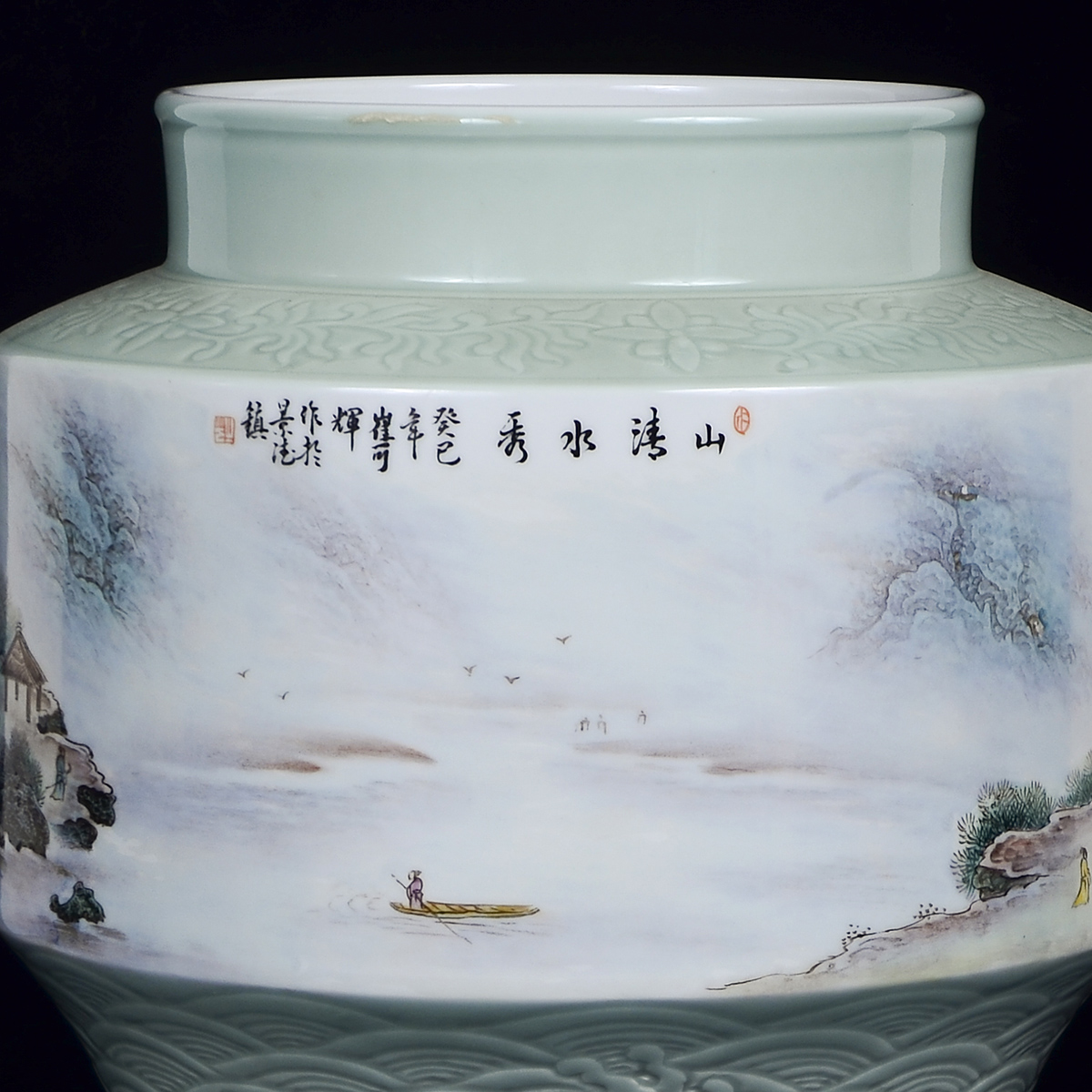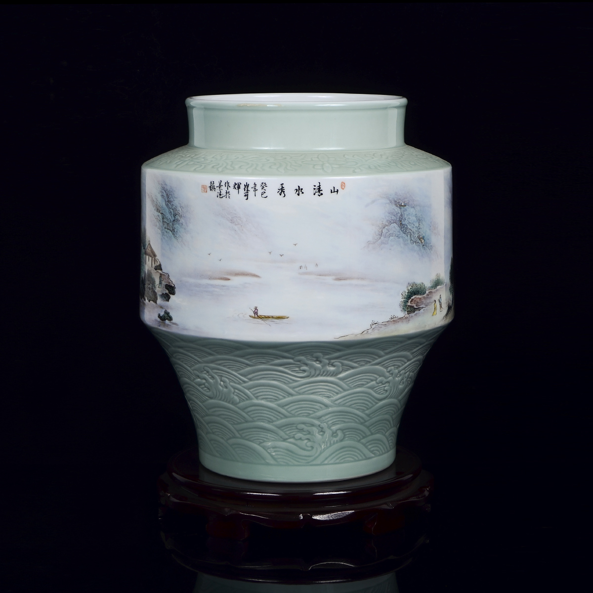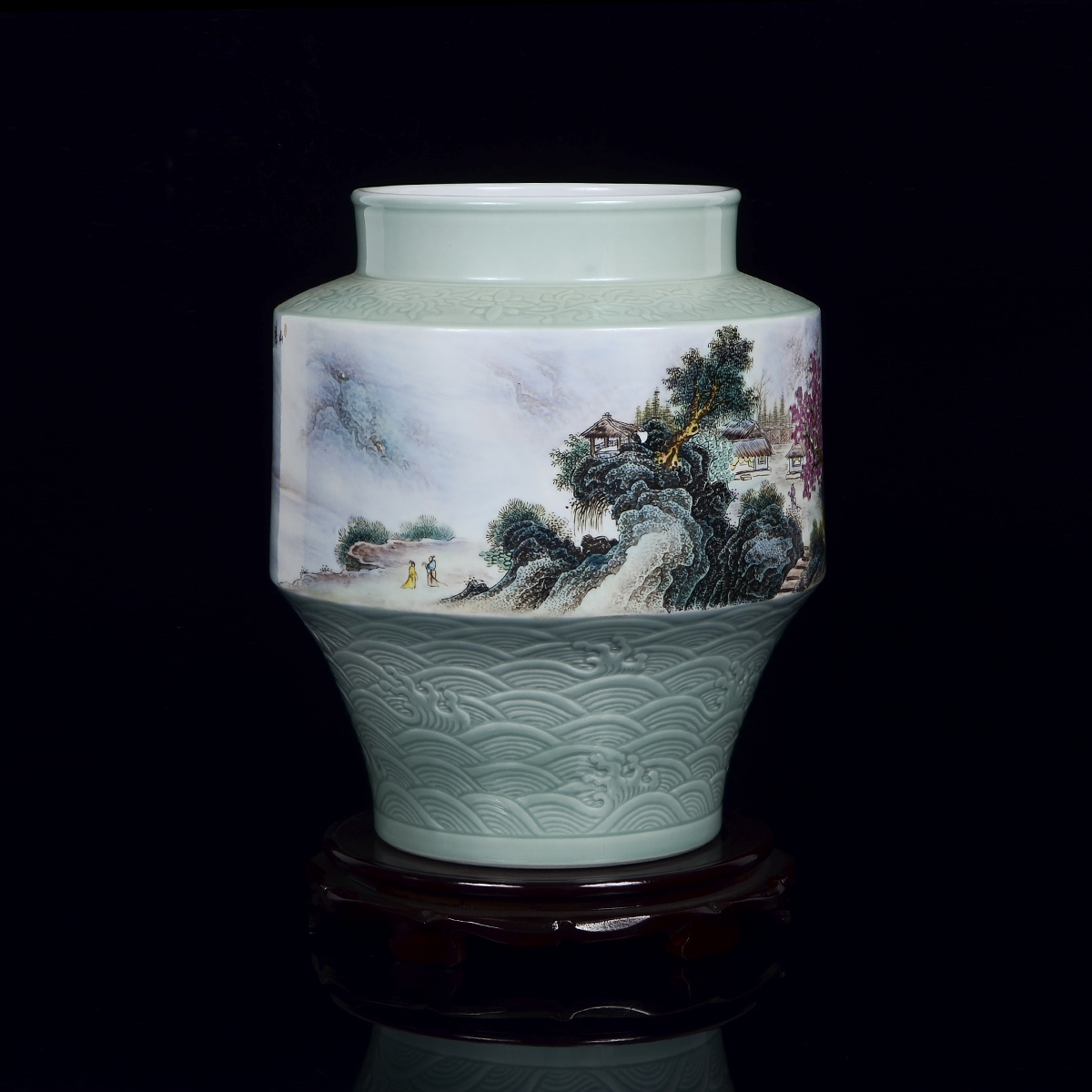 作品介绍:作品创作于2013年,与世博会金奖作品属同一风格。肩部刻花缠枝纹饰,足部刻以桃花海水纹,以青釉照面,温润剔透。瓶身用釉上工笔粉彩的手法创作,描绘入微,笔触丝丝分明。构图远近虚实相互交替,细腻的山石结构处理,植物的细致描绘让每一片树叶都在观者眼前,仿佛置身其中。