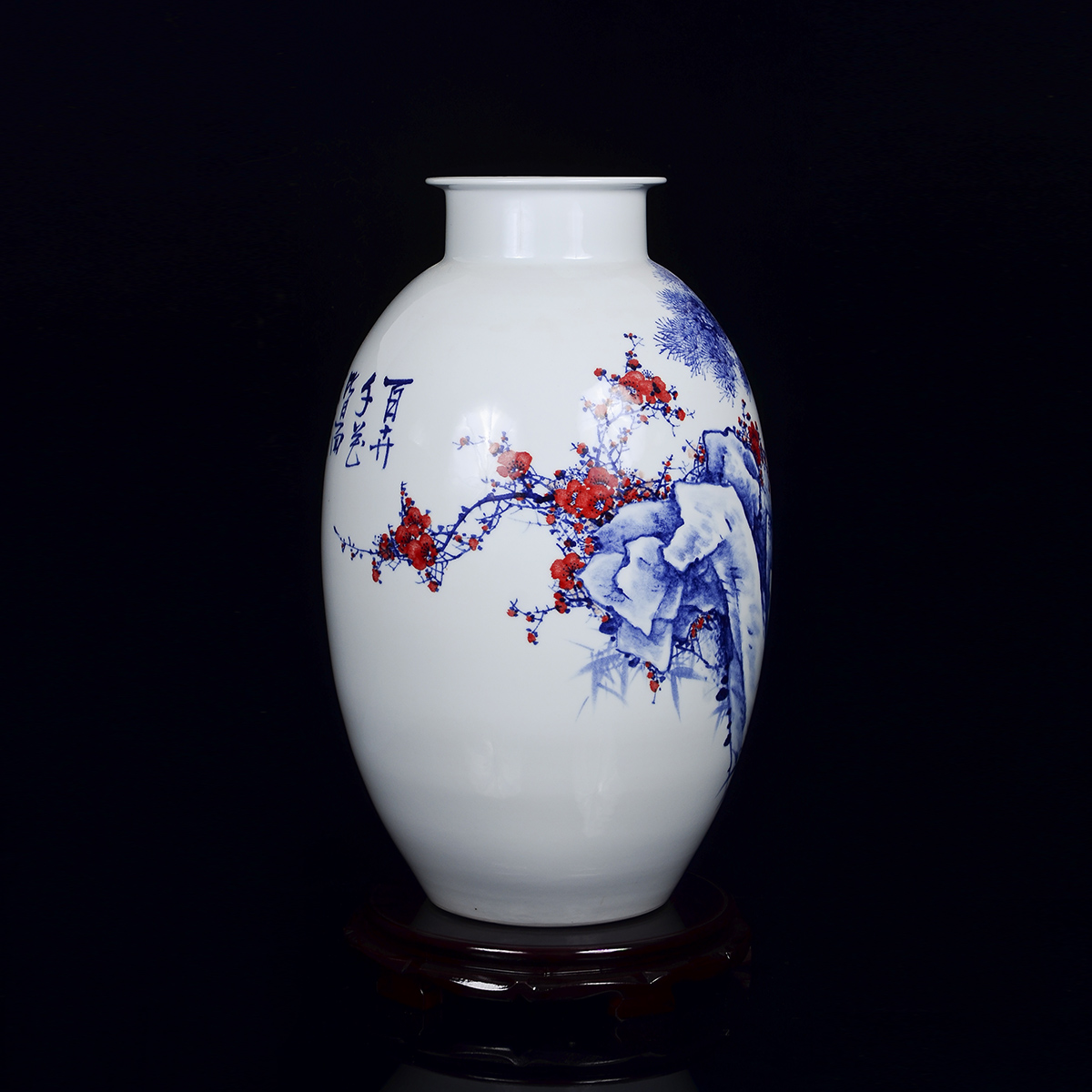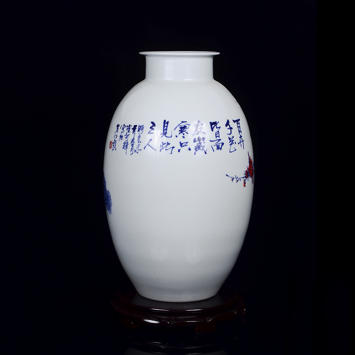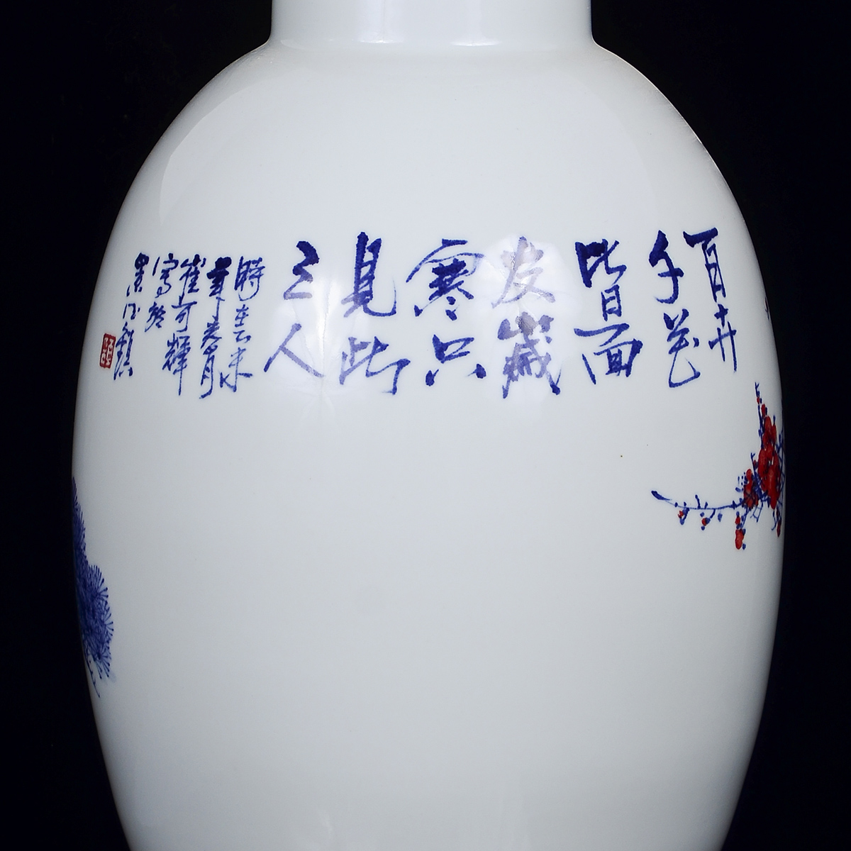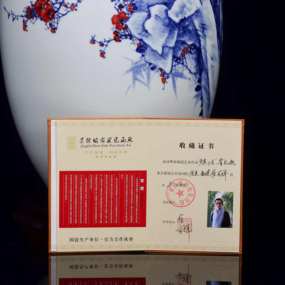 作品介绍:这件作品创作于2015年,采用釉下青花五彩装饰。青花瓷又称白地青花瓷,常简称青花,中华陶瓷烧制工艺的珍品。是中国瓷器的主流品种之一,青花瓷是用含氧化钴的钴矿为原料,在陶瓷坯体上描绘纹饰,再罩上一层透明釉,经高温还原焰一次烧成。钴料烧成后呈蓝色,具有着色力强、发色鲜艳、烧成率高、呈色稳定的特点.原始青花瓷于唐宋已见端倪,成熟的青花瓷则出现在元代景德镇的湖田窑。明代青花成为瓷器的主流,清康熙时发展到了顶峰。