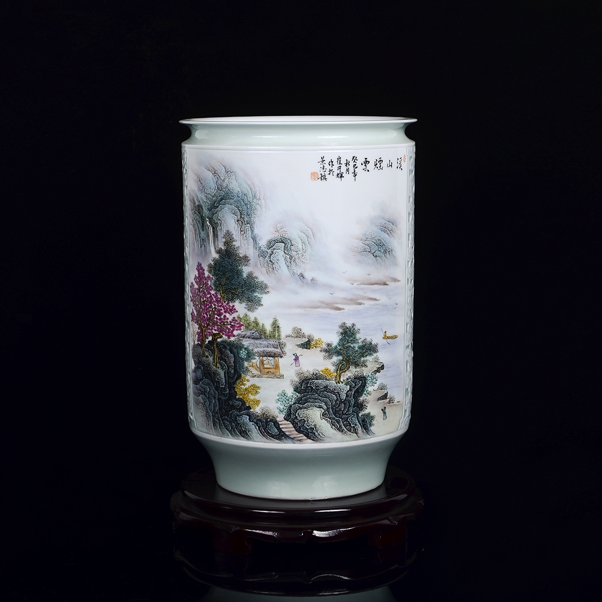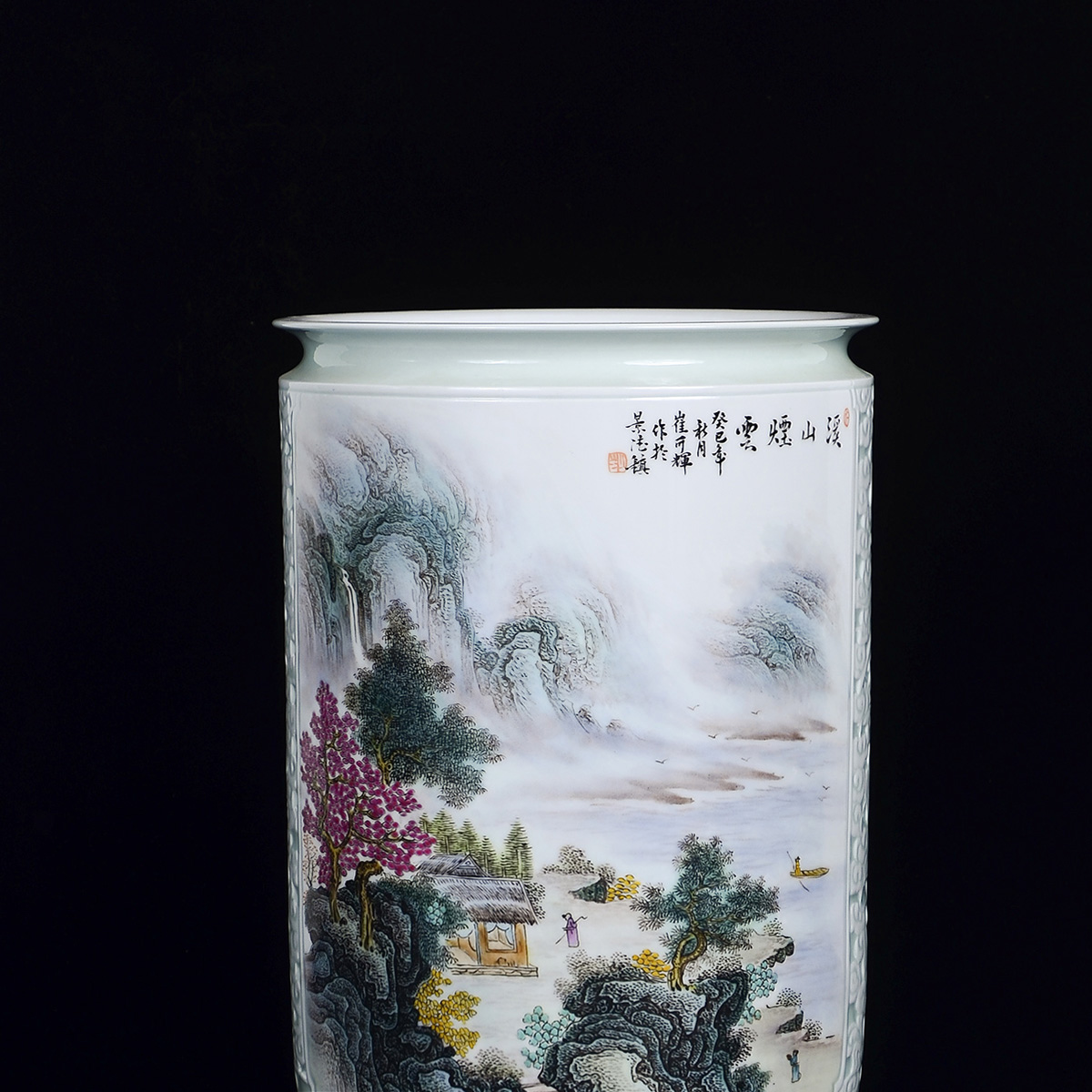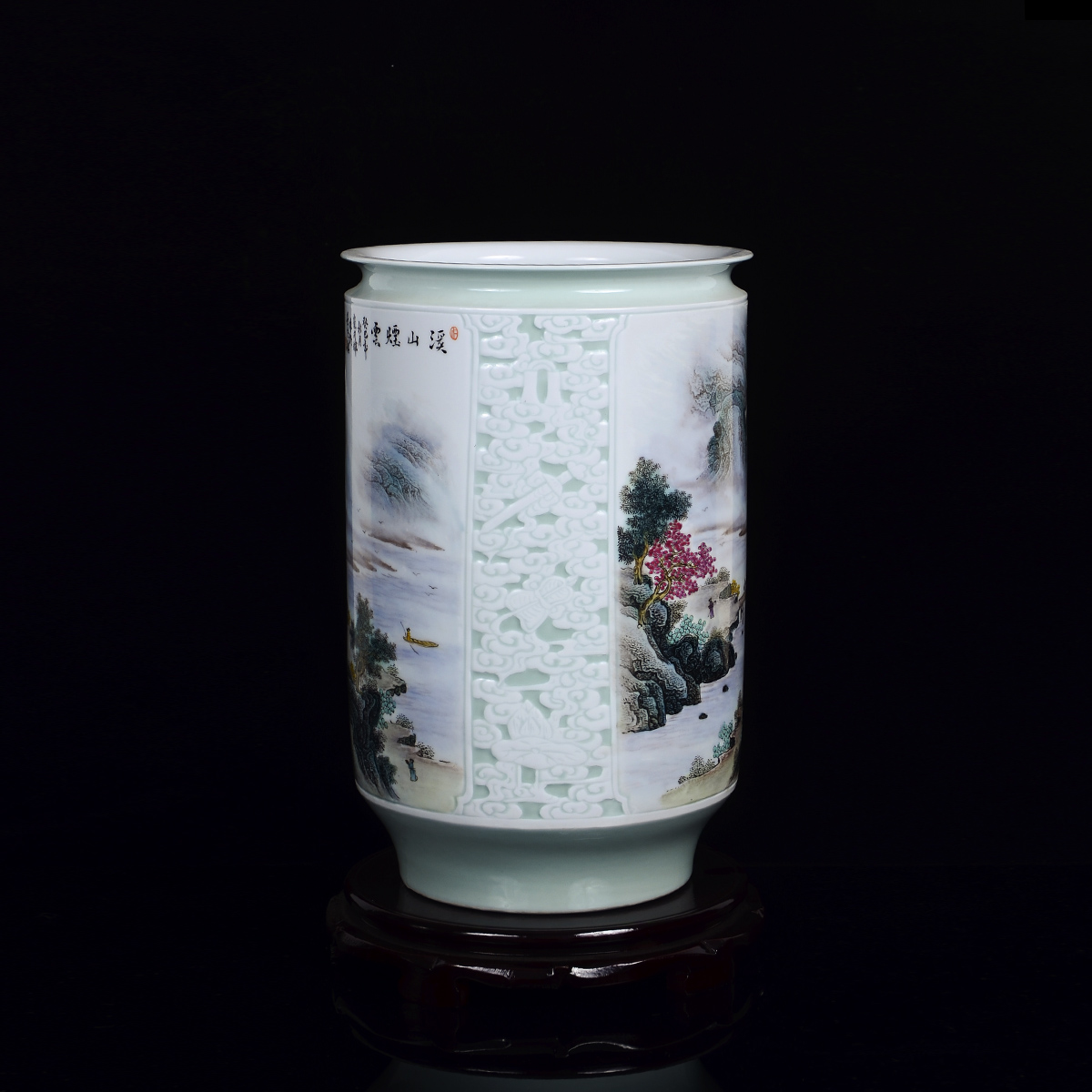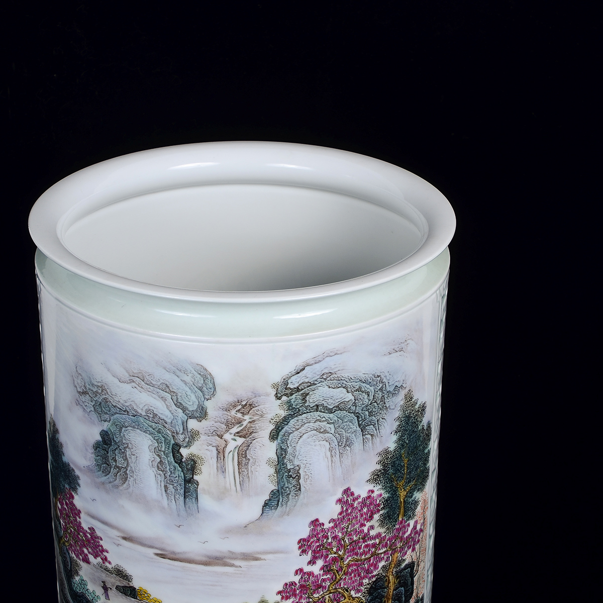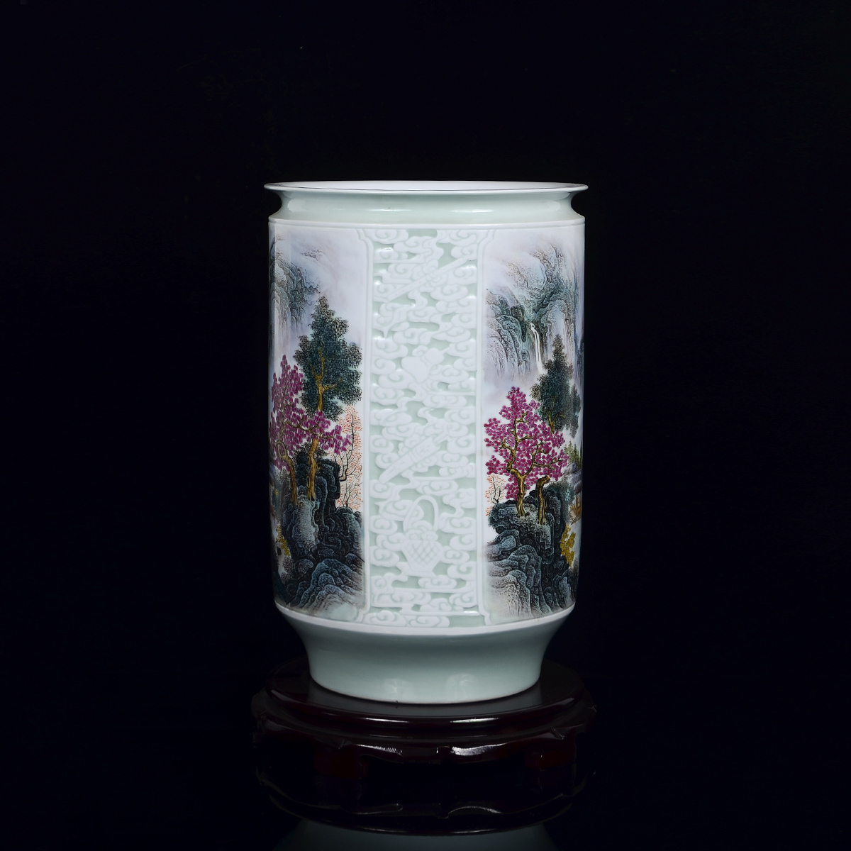 作品介绍:作品创作于2013年,与世博会金奖作品属同一风格。两侧浮雕吉祥八宝纹,以青釉照面,温润剔透。瓶身用釉上工笔粉彩的手法创作,描绘入微,笔触丝丝分明。构图远近虚实相互交替,细腻的山石结构处理,植物的细致描绘让每一片树叶都在观者眼前,仿佛置身其中。