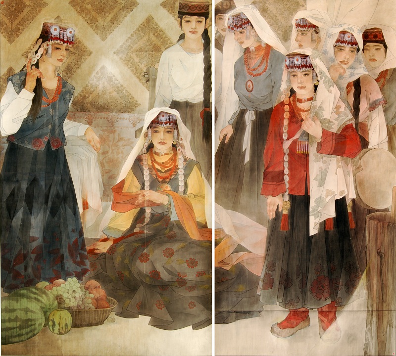林玉祥是谦虚的,从和他的对话中,感觉到一种坚持的精神,一种不管遇到什么事都不会放弃自己选择的创作之路。看他的工笔绘画,大都是人物,回眸一笑的塔吉克族姑娘、曼妙舞动的维吾尔族少女、吐峪沟的风景、草原上的奔马……会带着你一起进入工笔画的领域,在他的工笔画中领略到新疆的风土人情,那美丽的新疆少女,那飘着果香的美丽地方……。