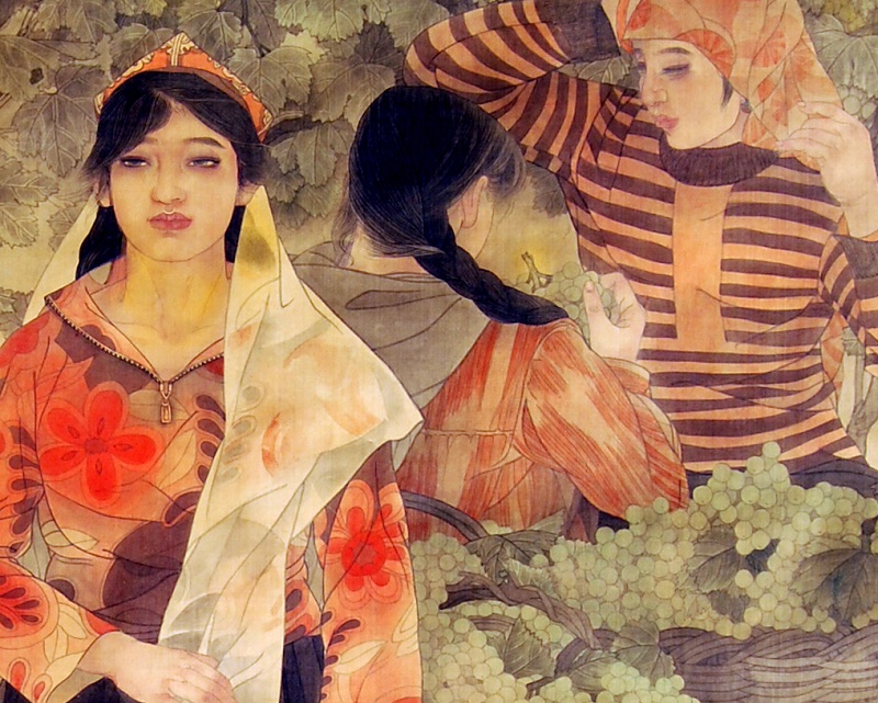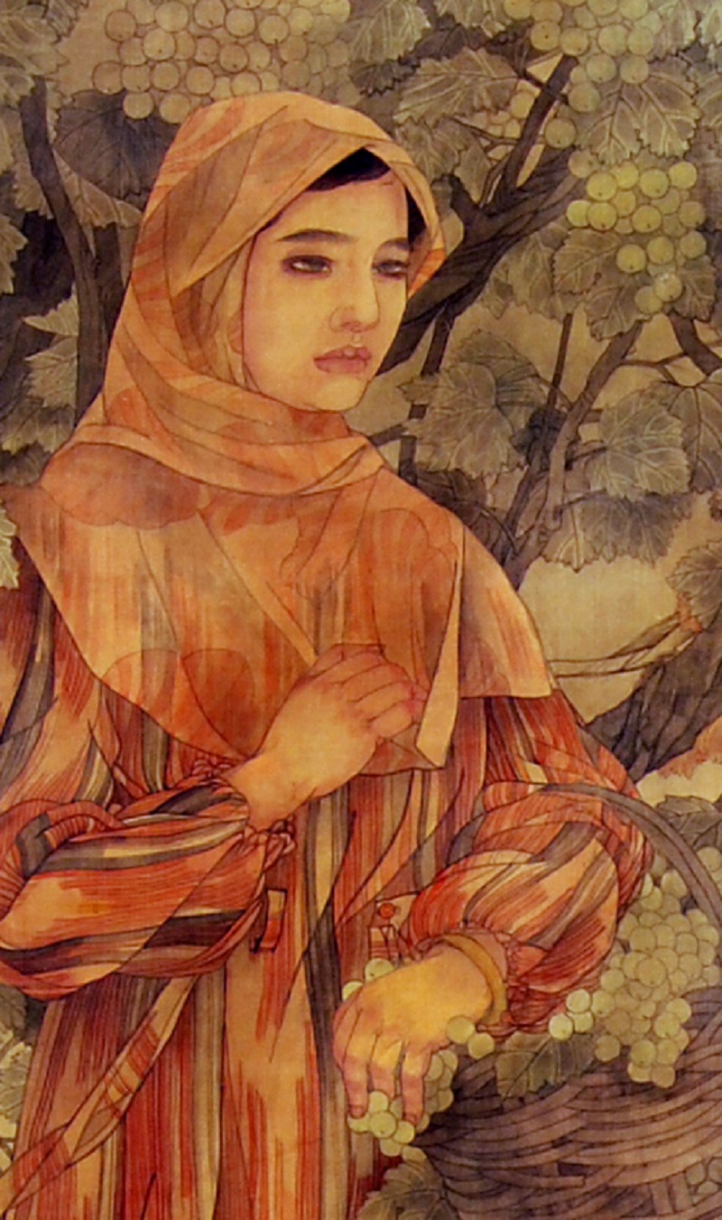 林玉祥是谦虚的,从和他的对话中,感觉到一种坚持的精神,一种不管遇到什么事都不会放弃自己选择的创作之路。看他的工笔绘画,大都是人物,回眸一笑的塔吉克族姑娘、曼妙舞动的维吾尔族少女、吐峪沟的风景、草原上的奔马……会带着你一起进入工笔画的领域,在他的工笔画中领略到新疆的风土人情,那美丽的新疆少女,那飘着果香的美丽地方……。