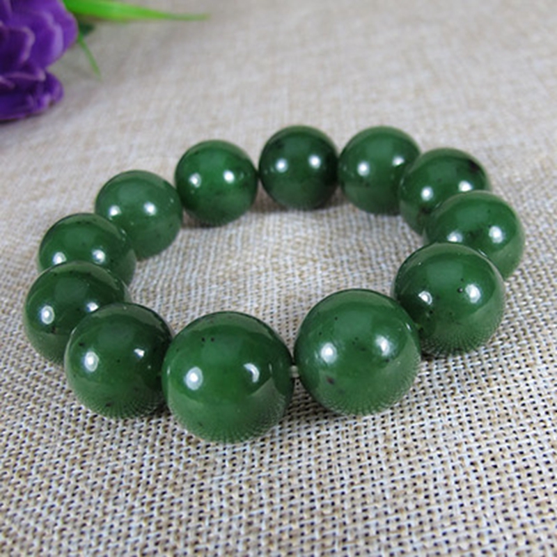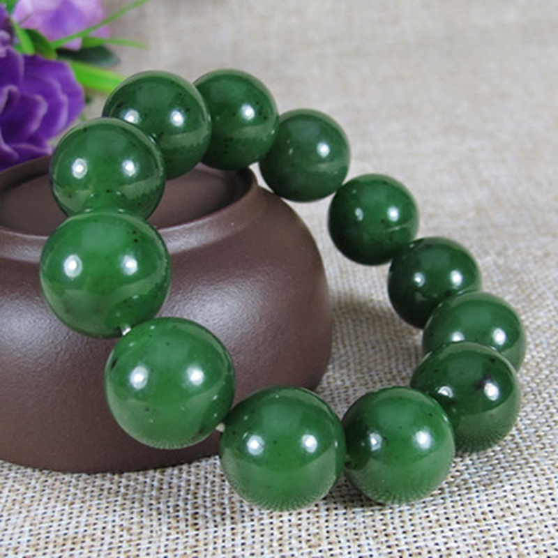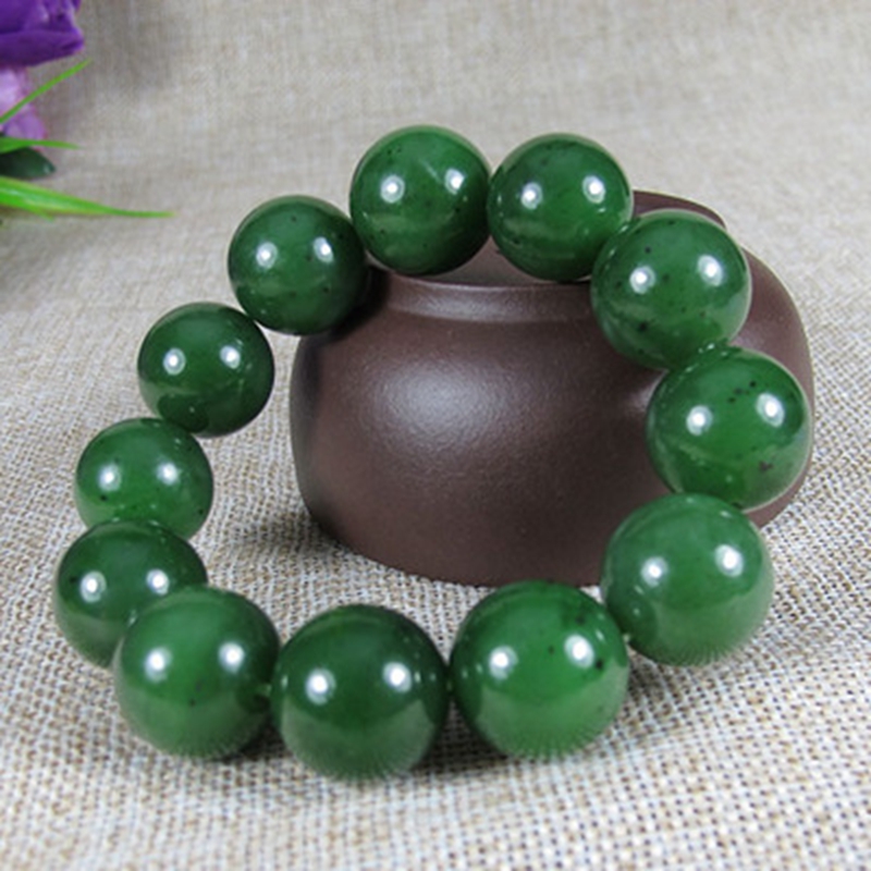 和田玉碧玉手链,由12颗直径18mm的饱满玉珠串连而成,菠菜绿,手感温润,珠体大小