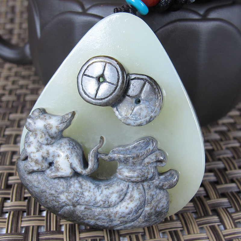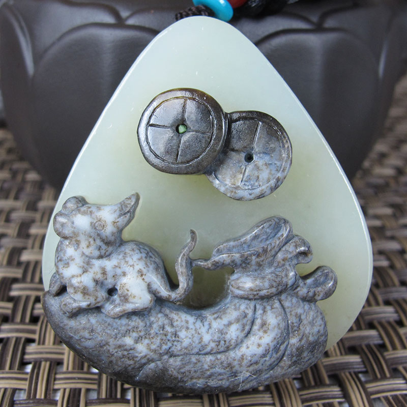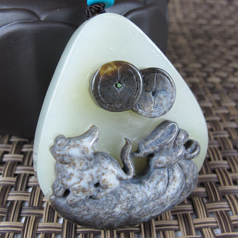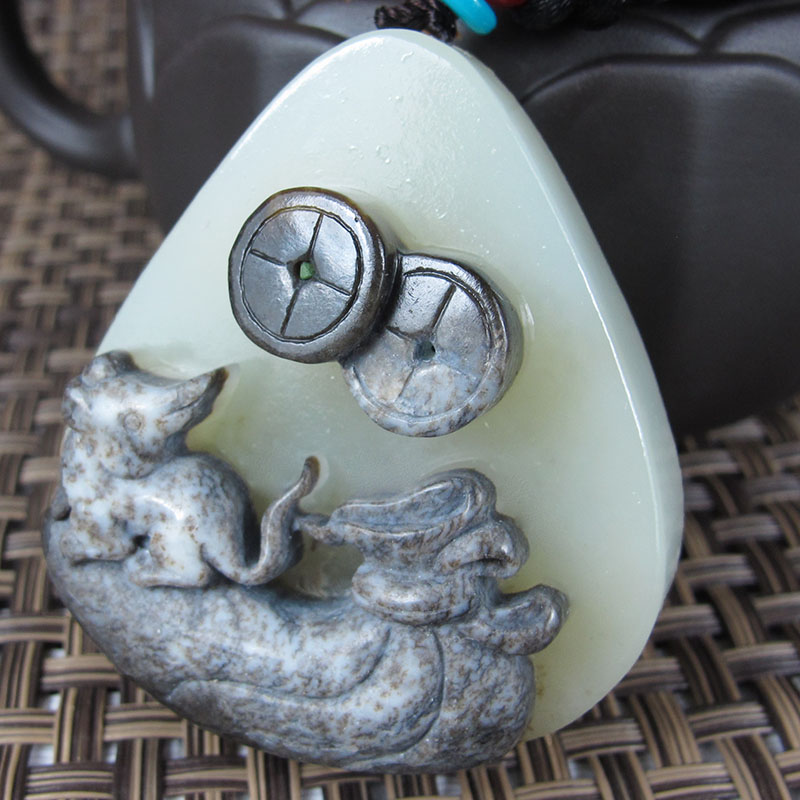 精雕和田玉代代数钱挂件,玉质细腻油润,手感温润,脂感浓厚,正面浮雕一鼠一钱币,