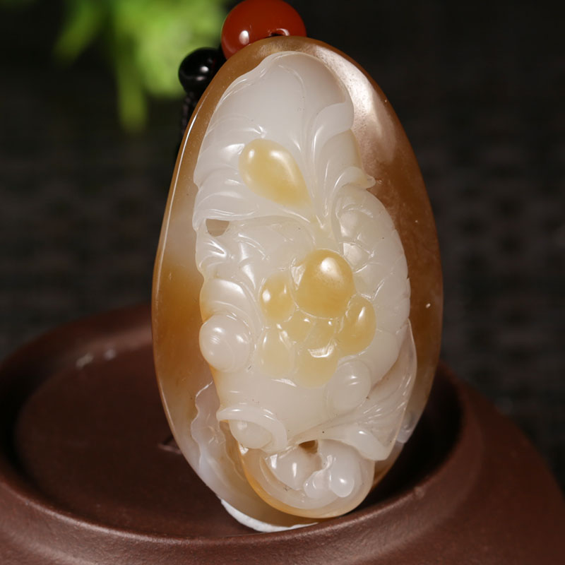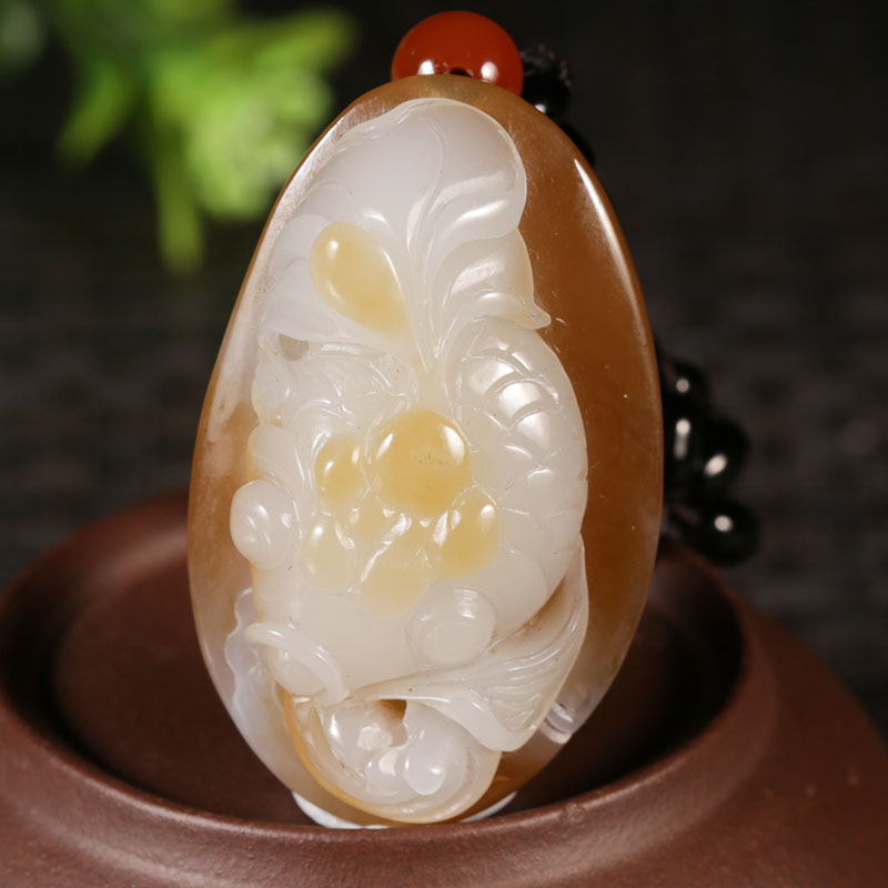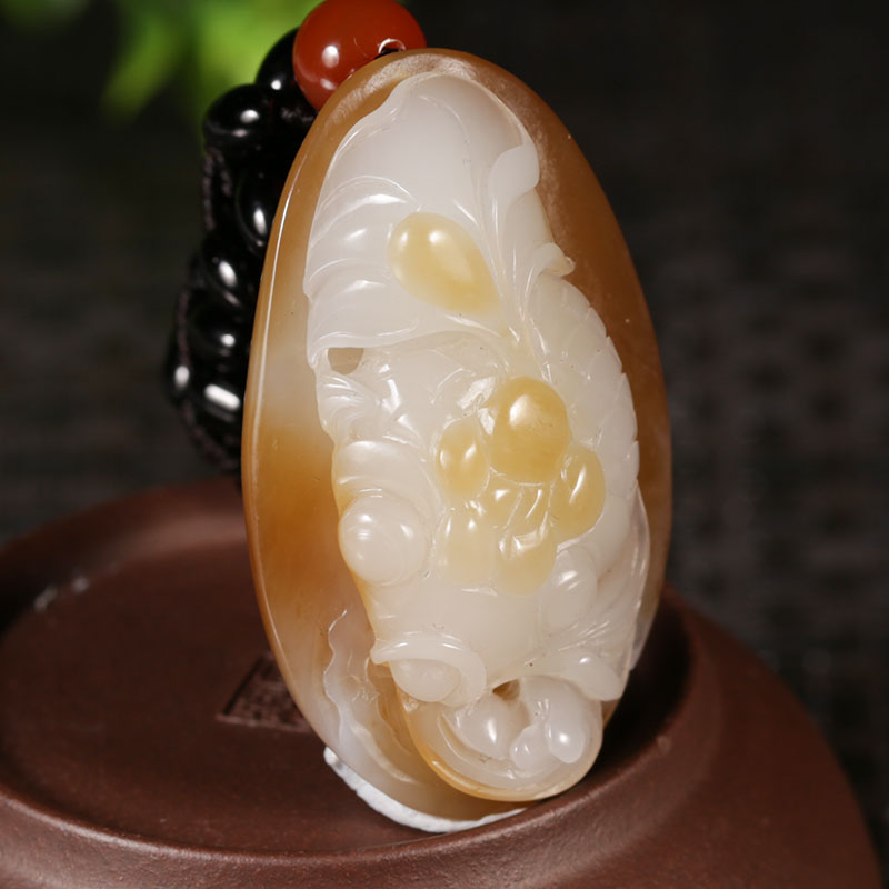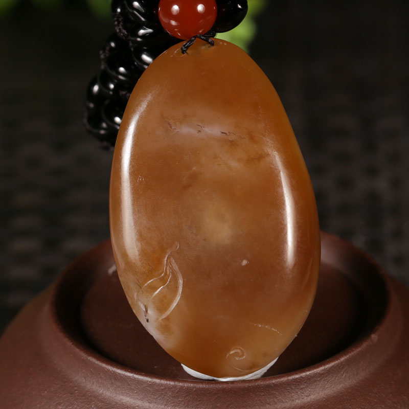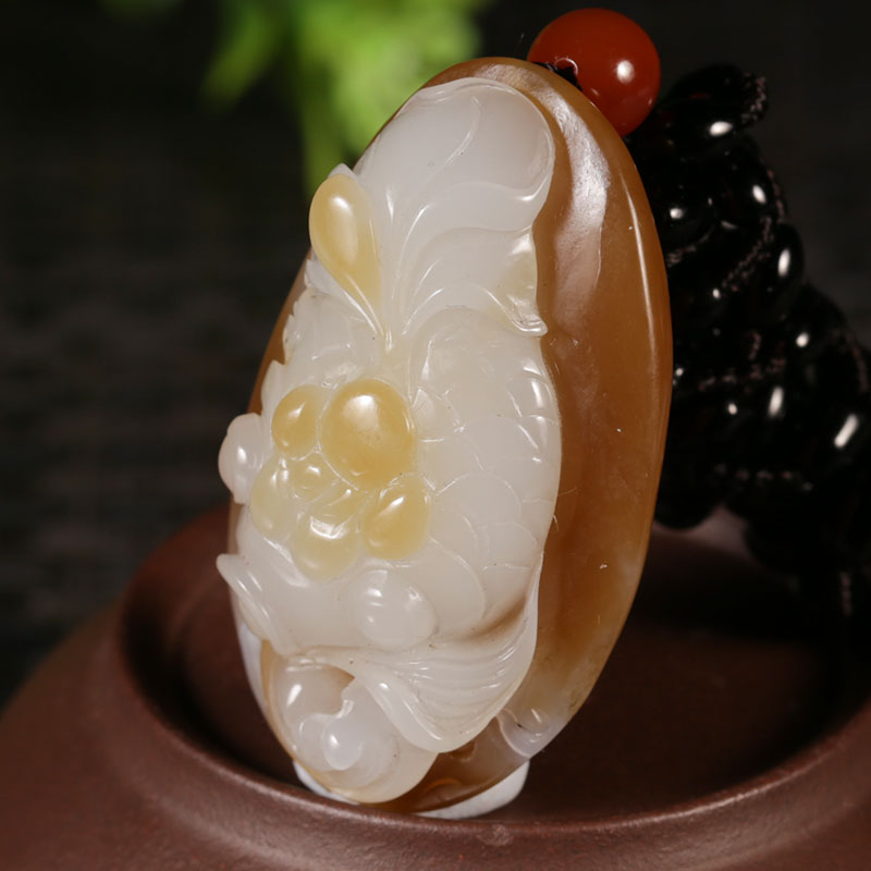 和田玉-金鱼,料细油润,形状饱满,形象生动,巧用俏色,生动自然。栩栩如生,金鱼