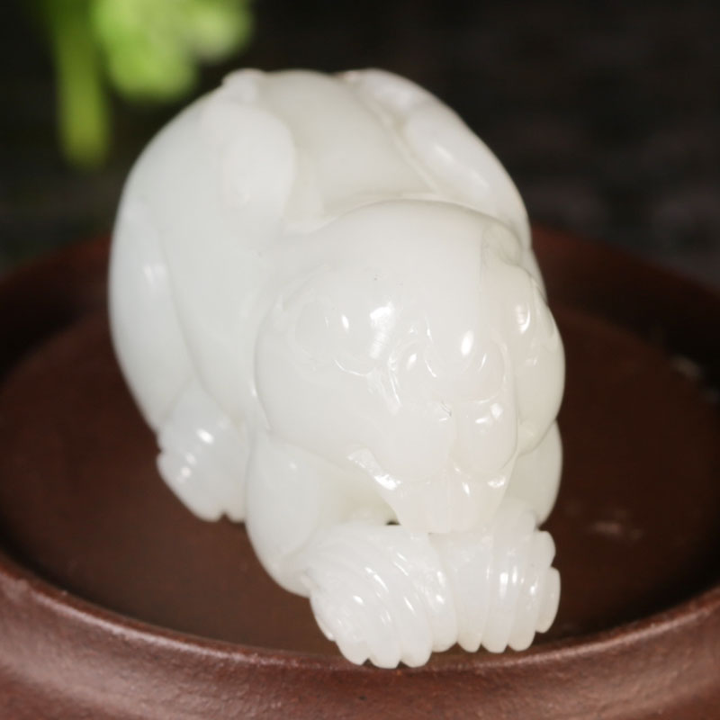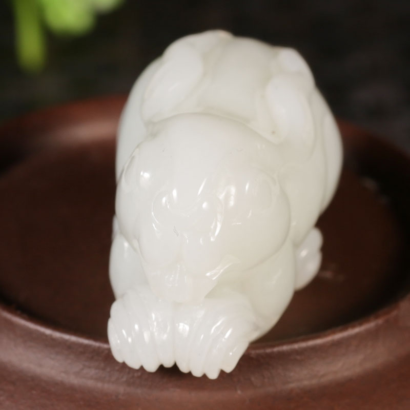 此款玉兔作品,玉质细润,造型精致,玉面雕刻一只兔子,肥壮墩圆,富有福态,栩栩